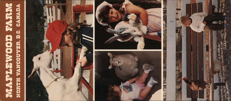 The postcard depicts various scenes of children interacting with farm animals, including goats, rabbits, sheep, and chickens, at Maplewood Farm.