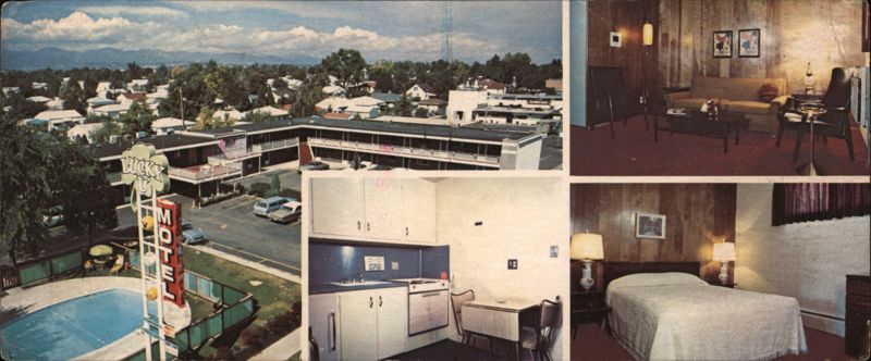 | Aerial view of the motel with a swimming pool, and interior views of a living room, kitchen/dining area, and bedroom. The motel offers one and two-bedroom apartments with electric kitchens, color TV, background music, and air conditioning. It is located five minutes from Centennial Turf Club and fifteen minutes from downtown Denver. |