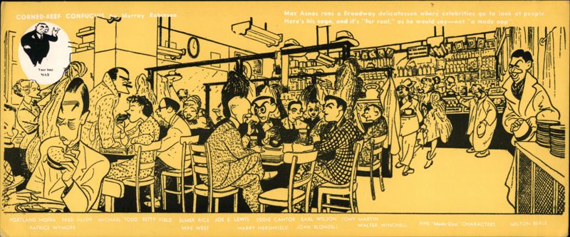 The front of the card features a detailed illustration titled "CORNED-BEEF CONFUCHIUS" by Murray Robinson, depicting a lively Broadway delicatessen, "Stage Delicatessen," run by Max Asnas. The scene is filled with caricatures of various celebrities, including Portland Hoffa, Fred Allen, Michael Todd, Betty Field, Elmer Rice, Joe E. Lewis, Eddie Cantor, Earl Wilson, Tony Martin, Patrice Wymore, Mae West, Harry Hershfield, Joan Blondell, Walter Winchell, and Milton Berle. The back provides the address (1384 Broadway, Bet. 37th and 38th Streets, New York City), phone number, and details about their catering services, special sandwiches, and operating hours. |