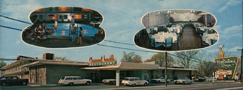 | Exterior view of the Holiday Inn and Charcoal Hearth Restaurant, with inset images of the swimming pool area and the dining room. Amenities include TV, room service, free ice, baby beds, valet & laundry service, banquet and convention facilities. |