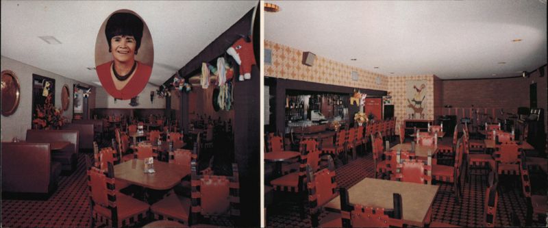 Interior view of Tortilla Flat restaurant featuring red booths, tables, and chairs, a bar area, and a large portrait of a woman.