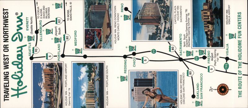 Promotional map showcasing Holiday Inn locations and their Holidome Fun Centers across California, Oregon, Washington, Idaho, Montana, and Nevada, with details on the Fresno Airport Holiday Inn.