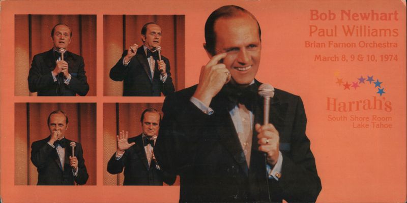 The front features Bob Newhart in multiple images, including a large central image and four smaller inset images, advertising his performance with Paul Williams and the Brian Farnon Orchestra at Harrah's South Shore Room, Lake Tahoe, from March 8-10, 1974. The back lists additional performers and dates for Harrah's in Reno and Lake Tahoe, including Wayne Newton, Merle Haggard, Sonny & Cher, Liza Minnelli, Herb Alpert, Bill Cosby, Sammy Davis, Jr., Jerry Lewis, Glen Campbell, John Davidson, and Don Rickles. |