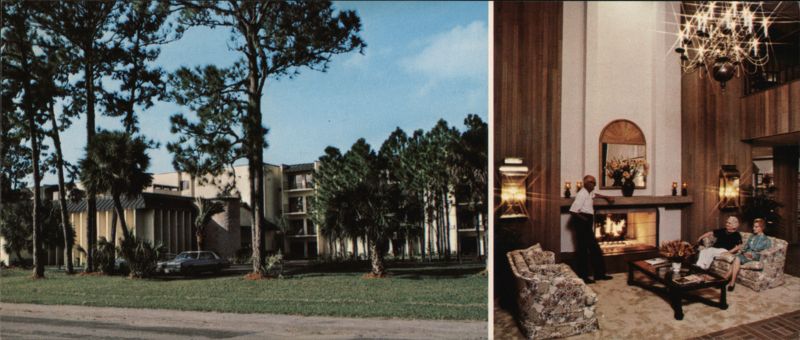 Exterior view of multi-story buildings surrounded by trees, and an interior view of a spacious living area with a fireplace and chandelier.