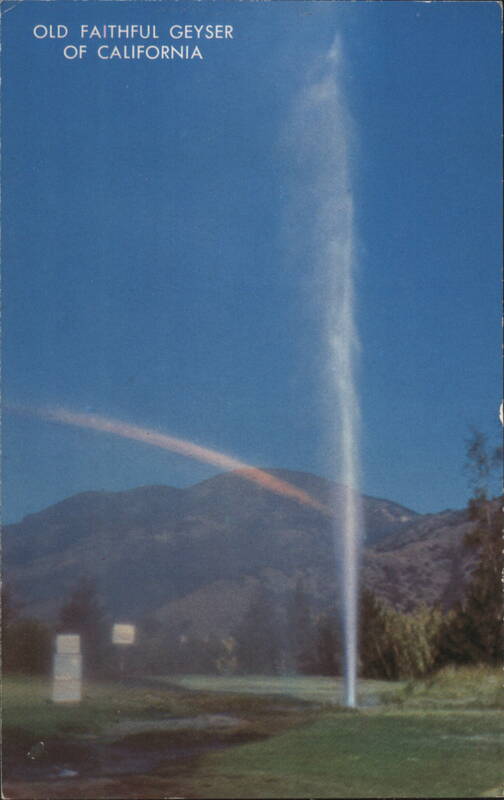 | This geyser is of statewide and worldwide interest, and many see it in its silent serene position and as it suddenly bursts forth from the earth. It is one of the three faithful geysers of the world, two miles north of Calistoga, on Tubbs Lane. It is in the upper end of beautiful Napa Valley. |