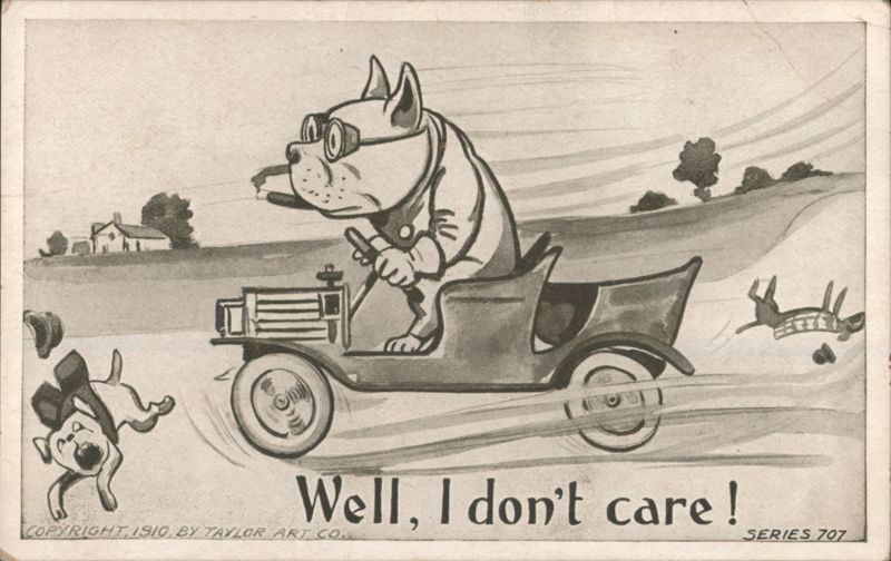A humorous illustration of an anthropomorphic bulldog wearing glasses and a coat, driving an early model automobile at speed. Another small dog barks at the car from the lower left.