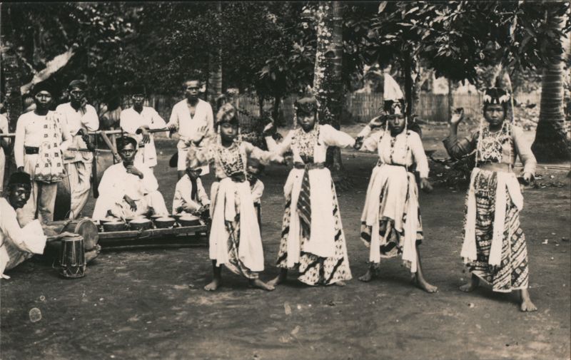 Four young women perform a traditional dance while men play drums and other instruments in the background.
