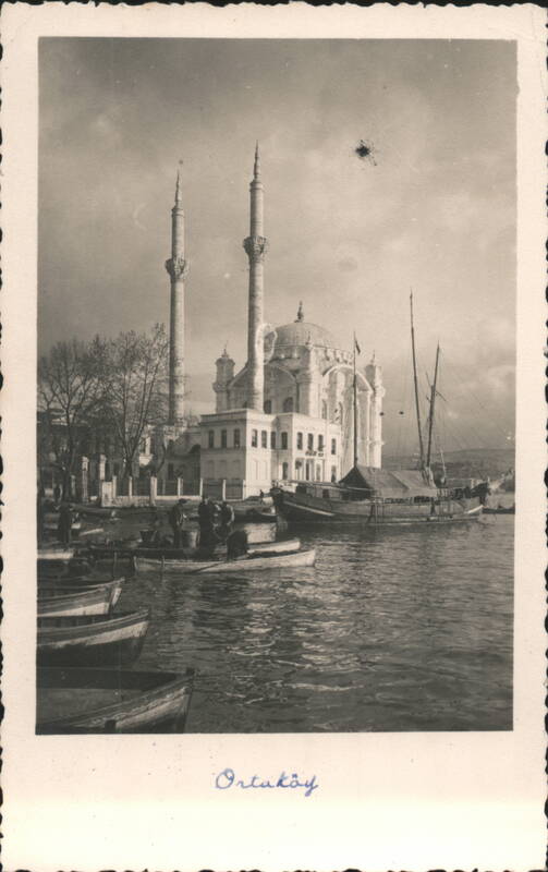 The Ortaköy Mosque is depicted on the Bosphorus strait, with several small boats in the foreground and people on the shore. The sky is cloudy.