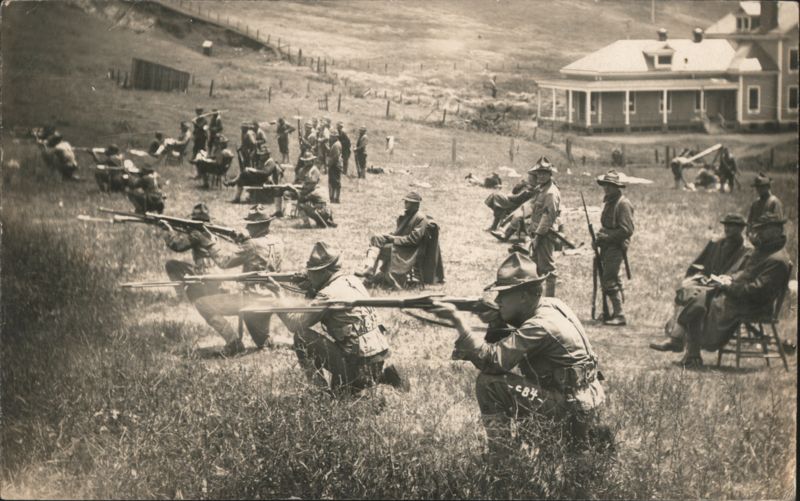 A group of soldiers in uniform are spread across a grassy hillside, some kneeling and aiming rifles, others sitting or standing. A large building is visible in the background. The scene depicts target practice at a military installation.