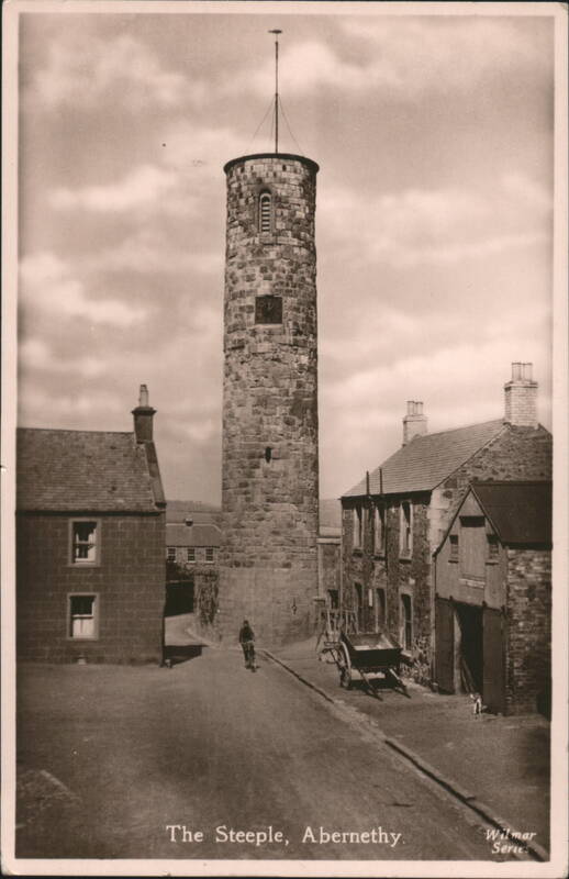 A tall, round stone tower, known as 'The Steeple,' stands prominently in a village setting. Stone buildings line a dirt road where a person on a bicycle and a cart are visible. The sky is cloudy.