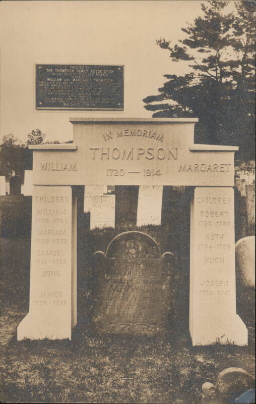Memorial erected by the Thompson Family Association for William and Margaret Thompson, pioneer settlers of Brunswick, Maine. The monument lists their children and also shows an older gravestone for Margaret Thompson.