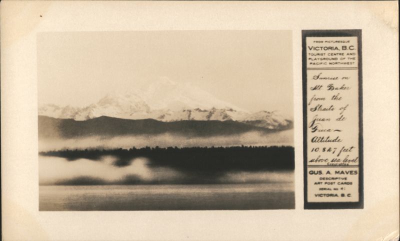 View of Mount Baker (10,827 feet above sea level) at sunrise, seen from the Strait of Juan de Fuca. Card published from Victoria, BC.