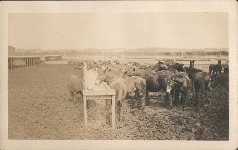 A large group of horses gathered around a long wooden feeding trough in a muddy enclosure. Other horses are visible in the background, along with farm structures.