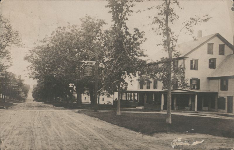 A view of the hotel from a dirt road, with trees lining the street. The sender describes it as 'a most beautiful place' and mentions visiting nearby Maplewood Hotel and Profile House.
