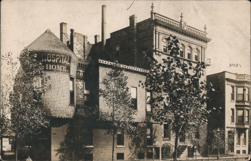A large brick building with a distinctive rounded tower on the left side, featuring the words "HOSPITAL & HOME" on its facade. The building has multiple windows, chimneys, and an ornate upper section on the main structure. Trees are visible in front, and another building is partially seen on the right. |