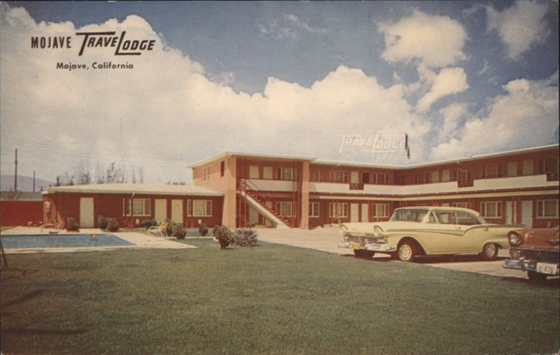 A mid-century view of the Mojave Travelodge motel, highlighting its swimming pool, grassy lawn, and a classic yellow car. The motel offered TV, swimming pool, and air conditioning, with access to desert recreation including hunting and fishing in the High Sierra. |