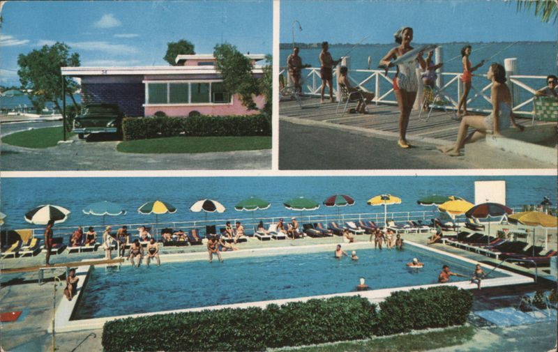 Motel building, people fishing from docks, and a swimming pool area with guests. Amenities include villas, solaria, lobby, card room, cocktail lounge, coffee shop, and spacious grounds.