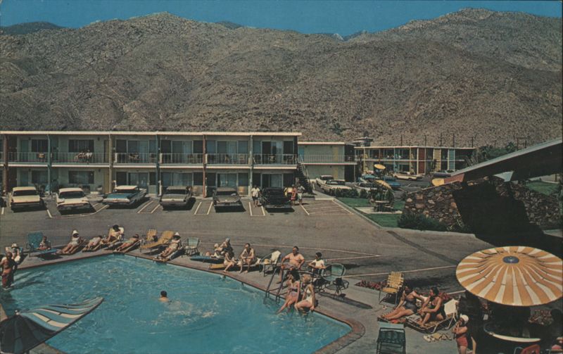 America's Desert Playground, featuring 160 luxurious, air-conditioned rooms, two heated swimming pools, shuffleboard, badminton, free TV, room music, telephone, and free coffee.