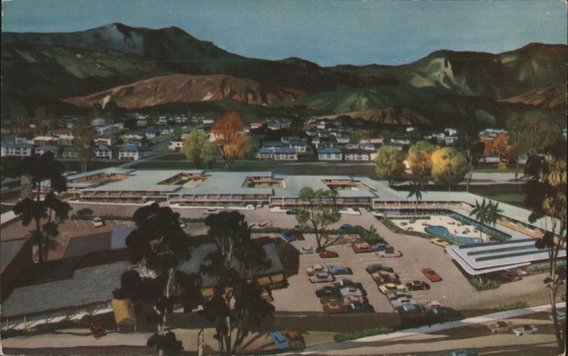 The front image displays an aerial perspective of the Villa Hotel complex, showcasing its extensive grounds with multiple buildings, several swimming pools, and large parking lots. The hotel is nestled within a community, with residential areas visible, all framed by a scenic mountainous landscape. |