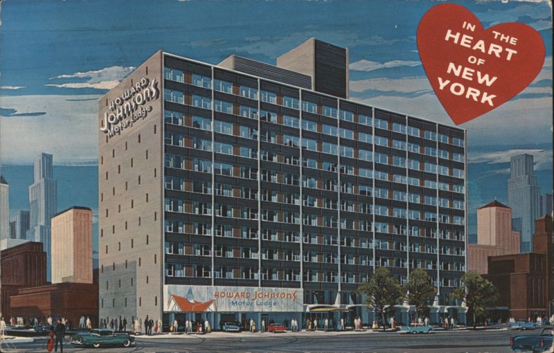 Multi-story Howard Johnson's Motor Lodge building in New York City. Features 300 oversized, air-conditioned rooms with color TV, free parking, a Howard Johnson's Restaurant and Cocktail lounge, and is within walking distance to theatres. |