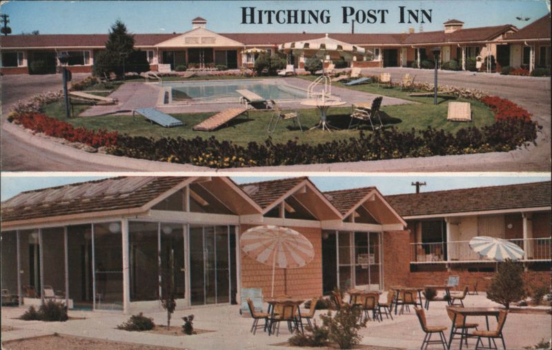 Exterior views of the Hitching Post Inn, featuring the swimming pool area, dining facilities, and guest rooms. The inn boasts 125 air-conditioned rooms, two heated pools, three dining rooms, a coffee shop, cocktail lounge, and complete banquet and convention facilities. |