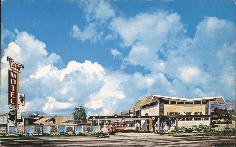 Another view of the Imperial '400' motel layout showing the eye catching building design, colorful fenced-in swimming pool and the attractive scotch plaid electric sign used in all locations. Aye, Royal Accommodations at Thr-Thrifty Rates. |