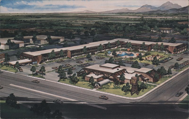 Aerial view of the hotel complex featuring 130 units, coffee shop, dining room, cocktail lounge, large swimming pool, recreation area, and children's playground. AAA approved.
