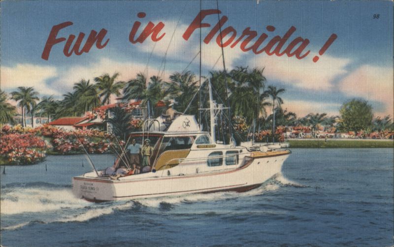 The card depicts a white and gold fishing boat named "SILVER KING II" with two men on board, cruising on blue water. Palm trees and houses are visible along the shore in the background under a partly cloudy sky. The text "Fun in Florida!" is printed in red across the top. |