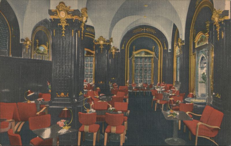 The exquisite new Ebony Room, featuring George Inness, Jr. original paintings, black rugs, rich black wall panels. Gold relief — A gay dash of scarlet furniture. Lighting from a colorful fountain and column cameos for a cocktail atmosphere of pleasant intimacy. |