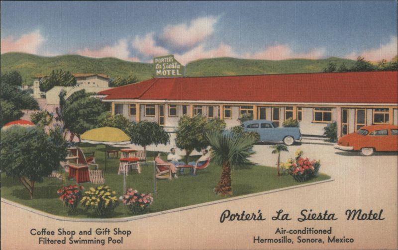 A view of Porter's La Siesta Motel featuring its coffee shop, gift shop, and filtered swimming pool. Cars are parked in front of the air-conditioned units.