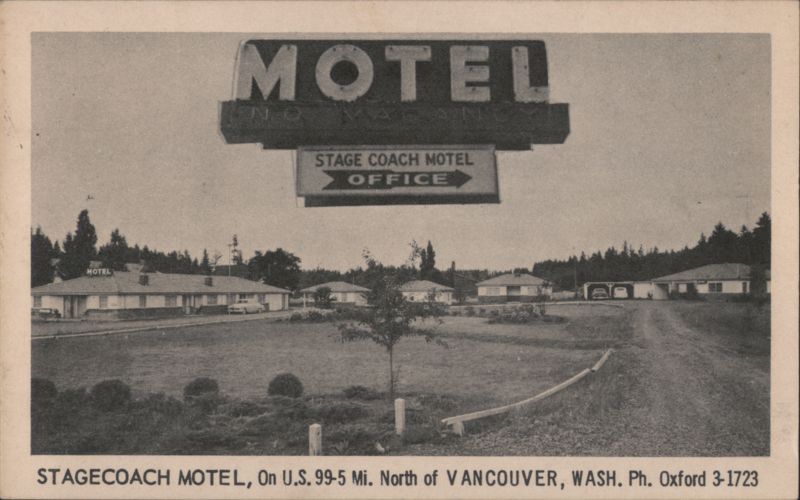 Multiple motel buildings visible, surrounded by trees, with a dirt road leading to the entrance. The large 'MOTEL' sign also indicates 'NO VACANCY' and 'STAGE COACH MOTEL OFFICE'.