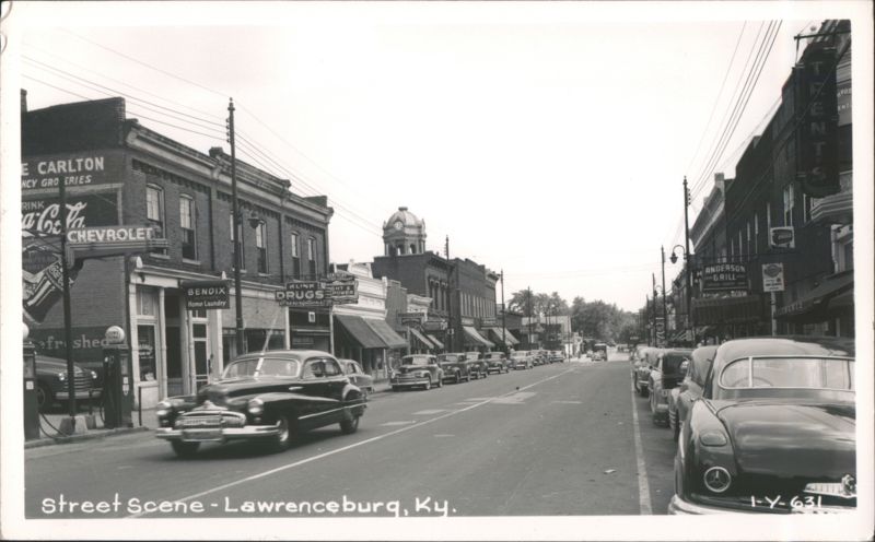 A view of a main street in Lawrenceburg, KY, featuring numerous parked automobiles, storefronts including Klink Drugs, Anderson Grill, and a Chevrolet dealership, with a prominent clock tower in the background. Gas pumps are visible on the left. |