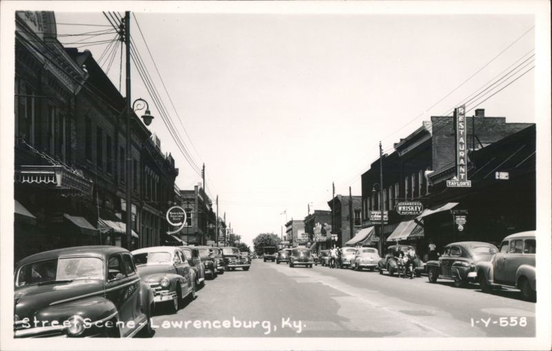 Downtown Street Scene with Vintage Cars and Shops, Lawrenceburg, KY