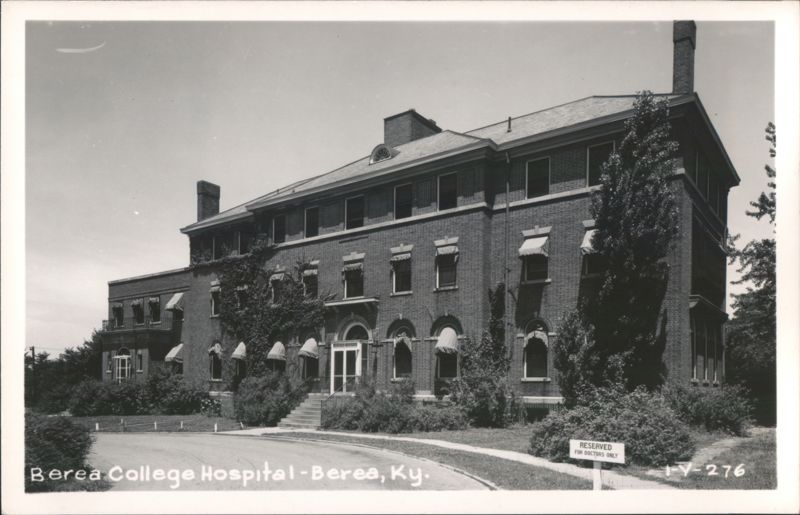 Brick hospital building with multiple windows, some with awnings, and ivy growing on the walls. A sign reads 'RESERVED FOR DOCTORS ONLY'.