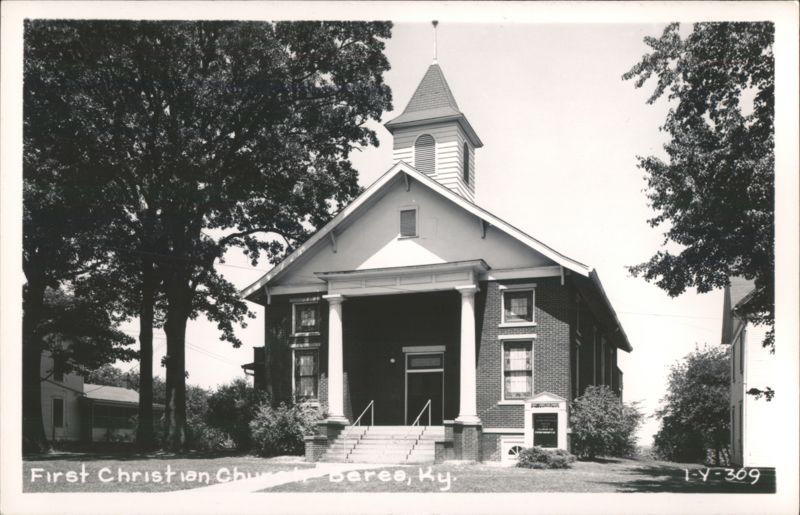 Exterior view of the First Christian Church, a brick building featuring a front portico with columns, a set of stairs, and a steeple. Large trees flank the church, and a church sign is visible near the entrance.