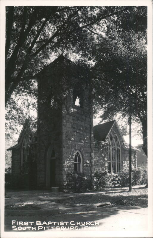 A stone church with a tall bell tower, Gothic arched windows, and a gabled roof, heavily shaded by large trees.