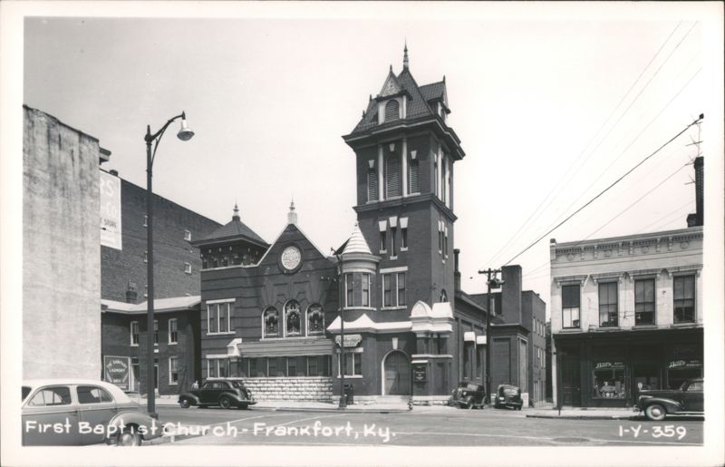 View of the First Baptist Church with cars parked on the street. Businesses like 'The Sanitary Laundry' and 'Bill's Auto Associate' are also visible.