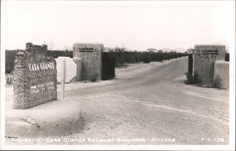 The entrance features a large stone sign and two concrete pillars flanking a dirt road. The sign details "PREHISTORIC RUINS", "GUIDE SERVICE 8:00 AM TO 3:00 PM", and "NATIONAL PARK SERVICE".