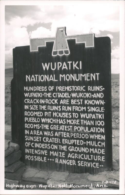 Hundreds of prehistoric ruins. Wupatki, The Citadel, Wukoki, and Crack-in-Rock are best known. In size the ruins run from single-roomed pit houses to Wupatki Pueblo which has more than 100 rooms. The greatest population in area was after period when Sunset Crater erupted. Mulch of cinders on the ground made intensive maize agriculture possible. Ranger Service. |