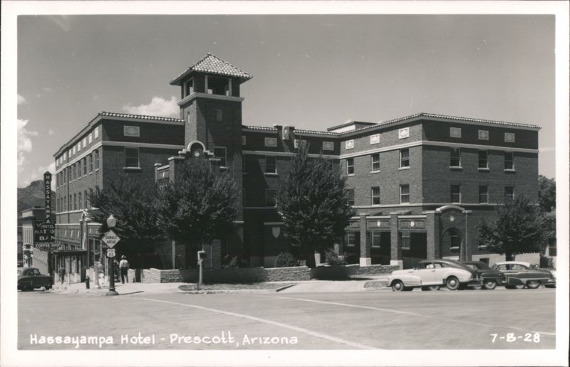 Exterior view of the multi-story brick Hassayampa Hotel, featuring a prominent tower with a tiled roof. Vintage cars are parked along the street, and people are visible walking on the sidewalk. A street sign for "SIGNALS AHEAD" and "ARIZONA 89" is also visible. |
