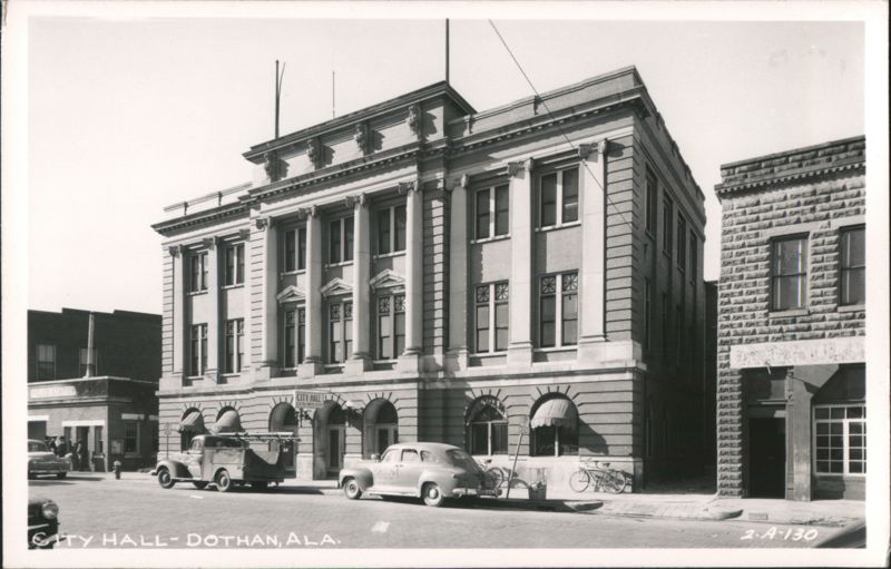 The City Hall building features classical architecture with columns and arched entrances, and a sign for 'ELECTRIC-WATER UTILITIES'. The adjacent building is identified as 'POLICE STATION'. Several cars and bicycles are parked on the street. |