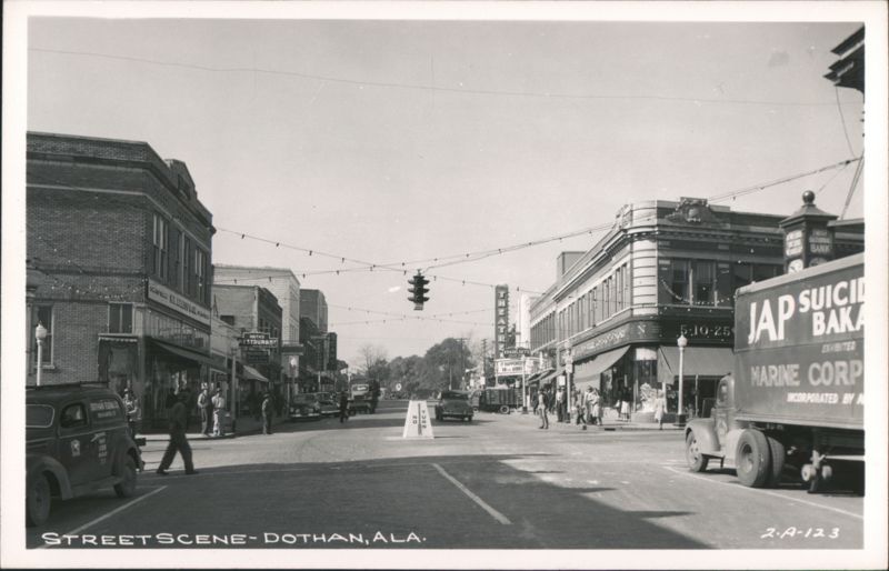 Street Scene in Dothan, Alabama with businesses, traffic, and pedestrians