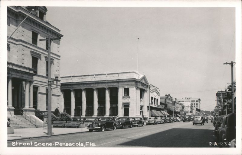 Busy street scene with classic cars and historic buildings, Pensacola