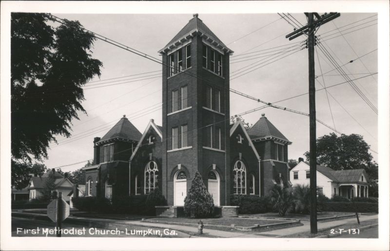A brick church building featuring a tall central bell tower with louvered windows, flanked by two smaller towers with pyramidal roofs. Arched windows and white double doors are visible. Residential homes and trees are in the background, with utility lines in the foreground. |
