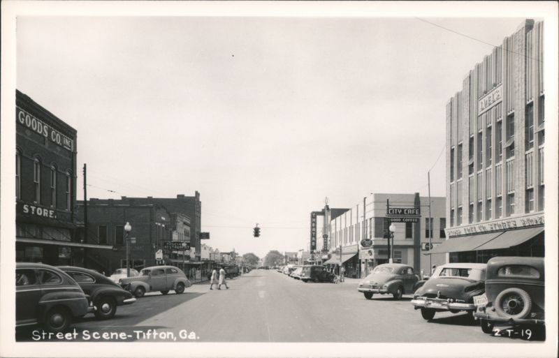 A bustling street scene featuring businesses such as Goods Co. Inc., Lupe's, City Cafe, and Poncia Restaurant. Several vintage automobiles are parked along the street and two pedestrians are crossing.
