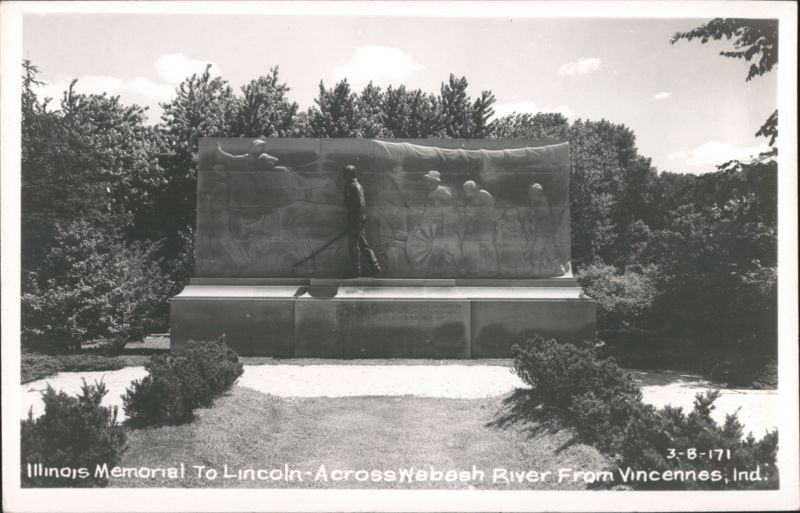 The monument depicts Abraham Lincoln and his family entering Illinois. Inscription reads: "IN THE LATE WINTER OF 1830 A FEW WEEKS AFTER HIS 21ST BIRTHDAY ABRAHAM LINCOLN PASSED THIS WAY WITH HIS FATHERS FAMILY ENTERING THE STATE OF ILLINOIS FOR THE FIRST TIME" |