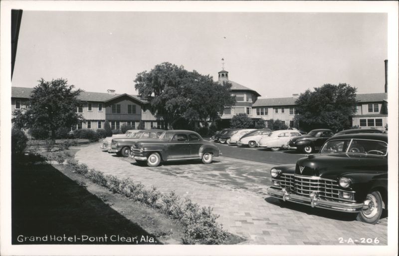 A view of the Grand Hotel complex with multiple cars parked along the drive, surrounded by mature trees and landscaping.
