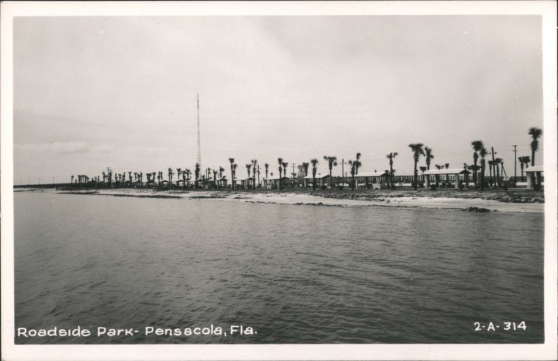 View of a waterfront park with numerous palm trees, small structures, and a long pier or bridge extending into the water. A tall antenna or tower is visible in the background.