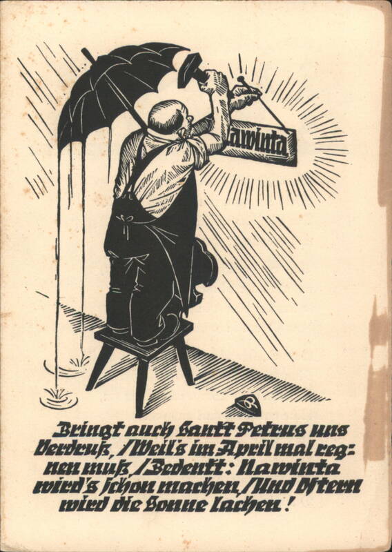 | Black and white illustration showing a man standing on a stool, holding an umbrella while hammering a sign reading "Nawinta" into a sunburst background. The umbrella drips heavily, symbolizing April rain. The German text reads: "Bringt auch sanft Petrus uns Verdruß, / Weil's im April mal reg- / nen muß / Bedeutt: Nawinta / wird's schön machen / Und Ostern / wird die Sonne lachen!". The reverse advertises "Windsheimer Produkten" and call-off orders with year-end credit, concluding with a reminder to prepare for May 1st. |