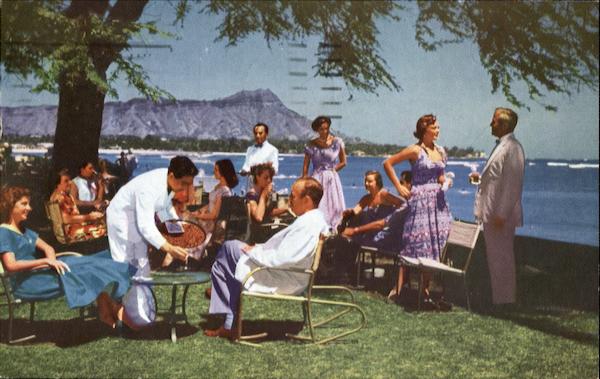 Cocktail hour on the Diamond Head Terrace, with its setting almost on the mighty blue Pacific. Notice the view of world famous Diamond Head in the background.